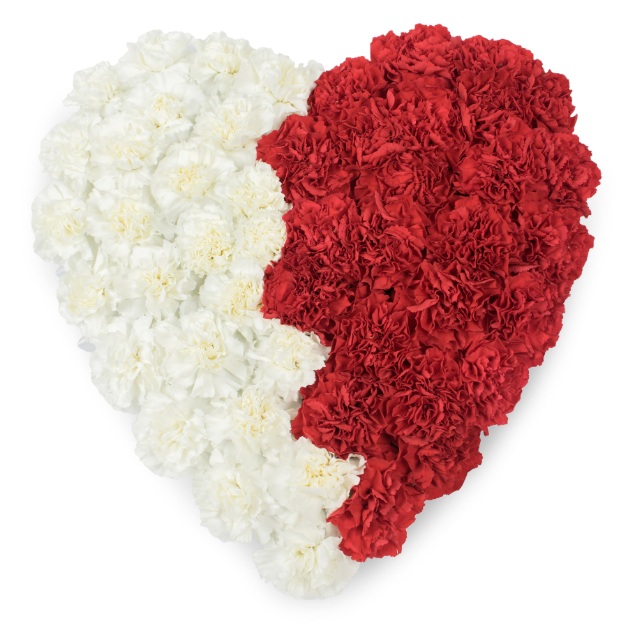 Our exquisite bouquet showcases a beautiful blend of white and red carnations, artfully arranged in a heart shape. This unique design is perfect for conveying deep emotions and appreciation.